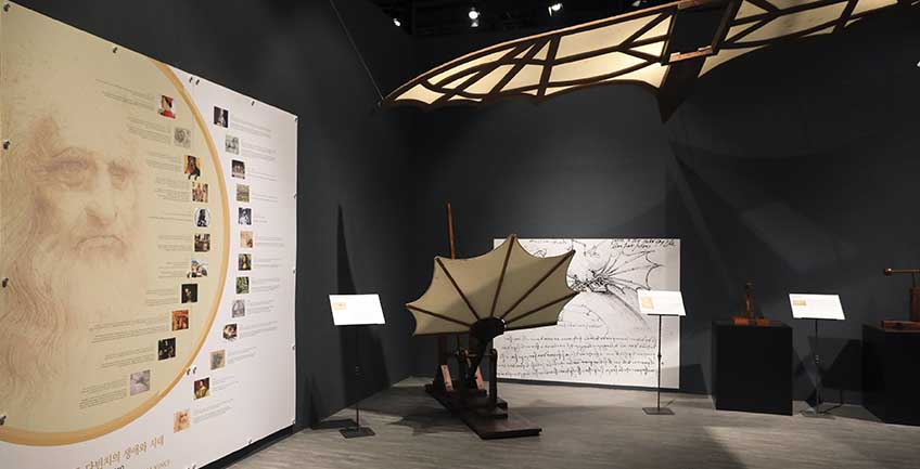 75 μοντέλα των εφευρέσεών του, αναπαραγωγές σε φυσικό μέγεθος, διαδραστικές μηχανές, αντίγραφα των περίφημων κωδίκων του και συνολικά πάνω από 200 εκθέματα σχεδιασμένα σε συνεργασία με το Μουσείο Leonardo da Vinci της Ρώμης.