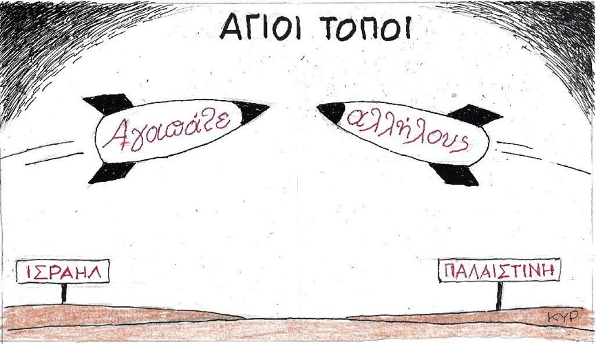 Μπορεί, πράγματι, όλα τα μεγάλα μέσα ενημέρωσης της Ευρώπης, των ΗΠΑ και όλων των νατοϊκών χωρών να προπαγανδίζουν με κάθε τρόπο το παραπάνω τροπάρι καταδίκης τής Χαμάς. Υπάρχουν, όμως, και κάποιοι γελοιογράφοι σαν τον ΚΥΡ, που, εμφορούμενοι από αστικο-χριστιανική ιδεολογία, γελοιοποιούνται με σκίτσα σαν το παρακάτω, εξισώνοντας το ισραηλινό κράτος-δολοφόνο με την παλαιστινιακή αντίσταση και αποδίδοντας τελικά την ίδια ευθύνη στον θύτη και στα θύματά του… Μοιάζει να τους φωνάζει «Μην σκοτώνεστε σ’ αυτούς τους άγιους τόπους! Αγαπάτε αλλήλους!» [2]