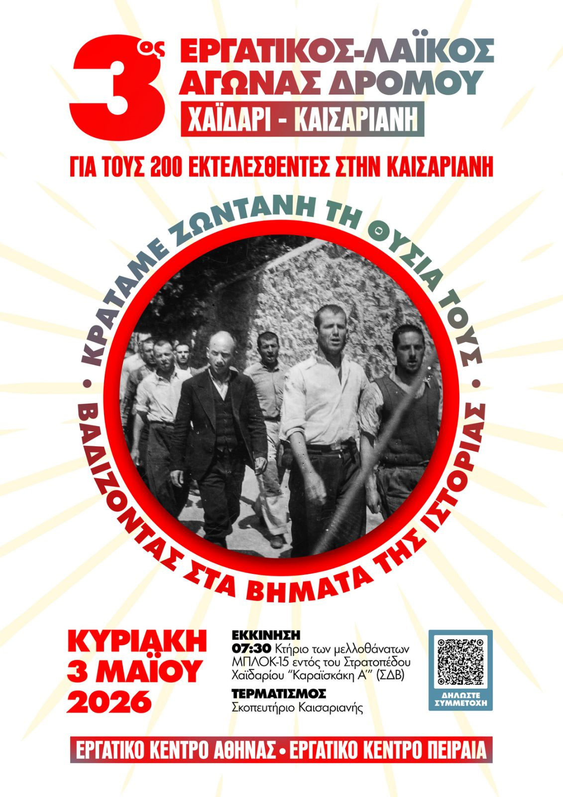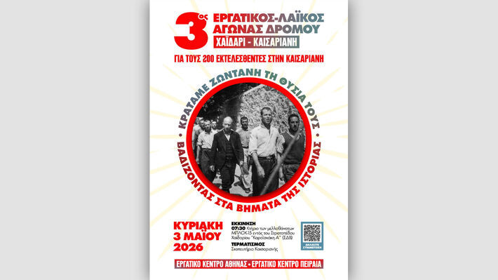 Την Κυριακή 3 Μάη: «Κρατάμε ζωντανή τη θυσία τους, βαδίζοντας στα βήματα της Ιστορίας» είναι το σύνθημα του φετινού εργατικού – λαϊκού αγώνα δρόμου από το Χαϊδάρι έως την Καισαριανή, που οργανώνεται για 3η συνεχόμενη χρονιά από τα Εργατικά Κέντρα Αθήνας και Πειραιά