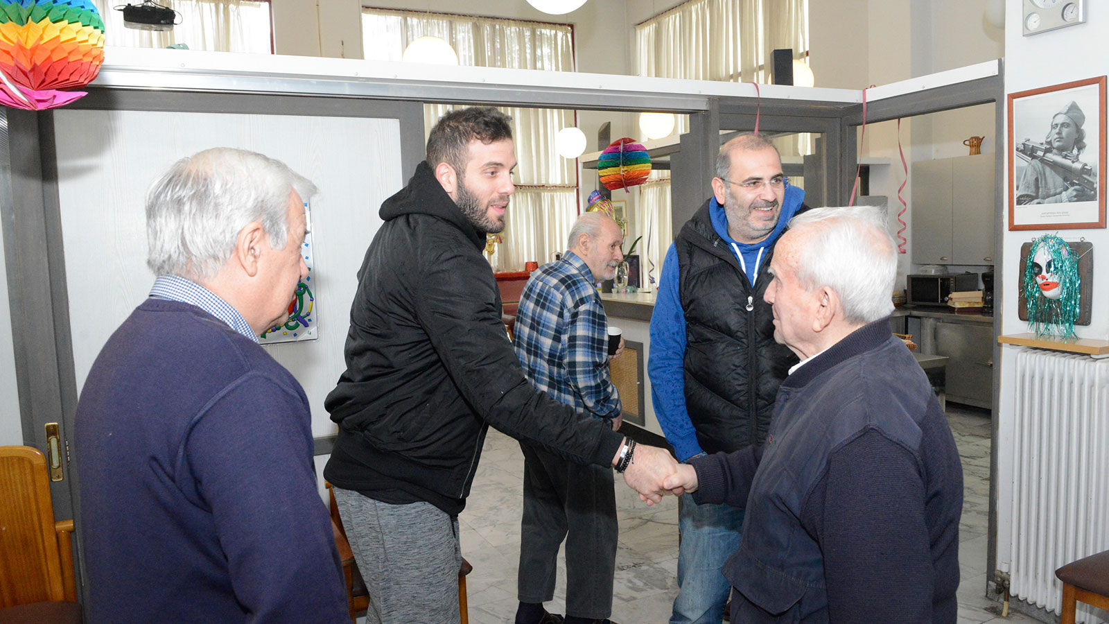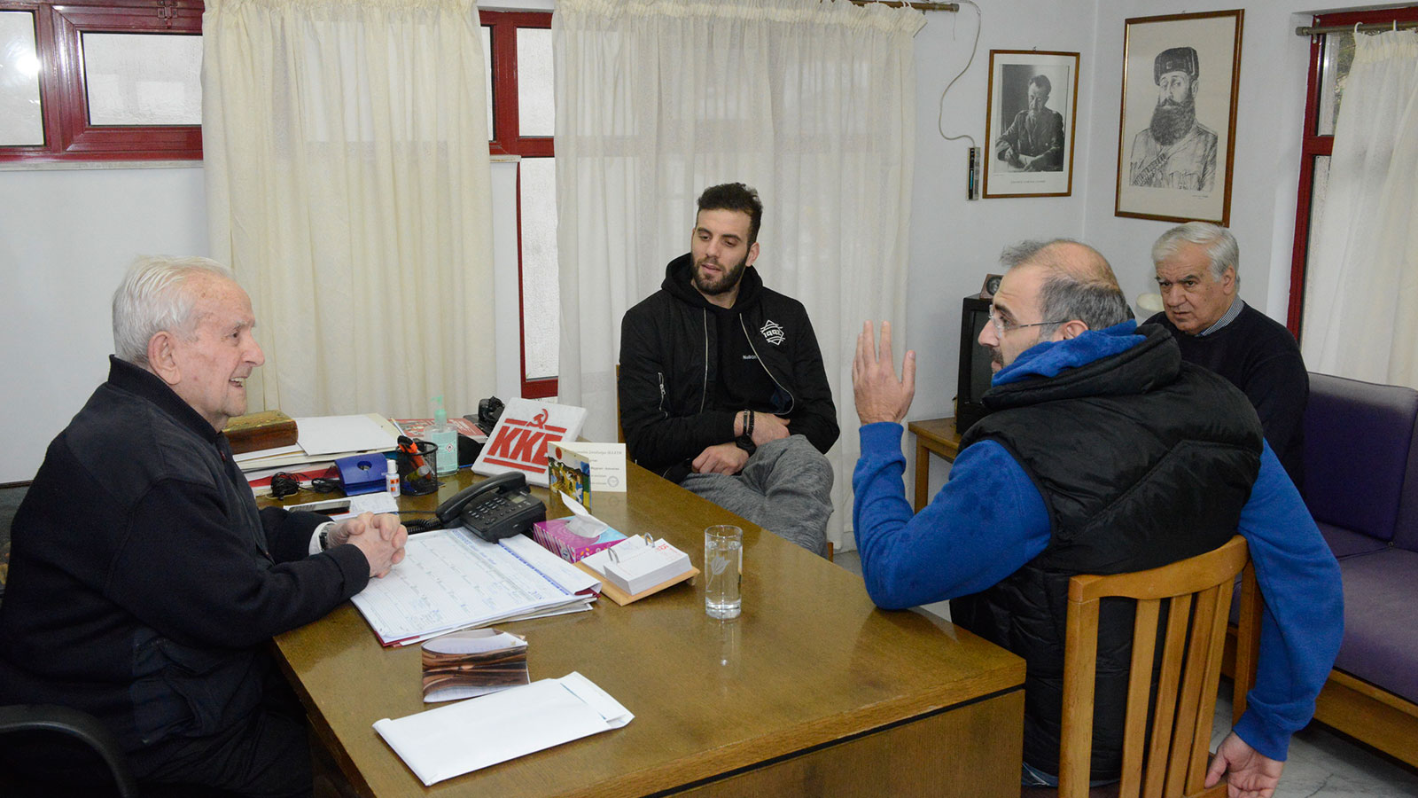 Σε ιδιαίτερη συνάντηση που ακολούθησε, ο πρόεδρος του «Σπιτιού του Αγωνιστή» ανέλυσε στον διεθνή μπασκετμπολίστα την ιστορία του Ιδρύματος που φιλοξενεί ηλικιωμένους αγωνιστές της Εθνικής Αντίστασης. Πρόκειται για ένα κοινωφελές ίδρυμα, που στόχο έχει την παροχή βοήθειας (ηθικής, πνευματικής και υλικής), συμπαράστασης και περίθαλψης σε ηλικιωμένους αγωνιστές της Εθνικής Αντίστασης και του αντιφασιστικού – δημοκρατικού αγώνα του λαού μας. Αγωνιστές που πολέμησαν και τσάκισαν τον φασισμό και τον ναζισμό στη χώρα μας. Επισήμανε ότι το «Σπίτι του Αγωνιστή» λειτουργεί χάρη στις προσφορές των εργαζομένων, του λαού αλλά και τη στήριξη του ΚΚΕ.