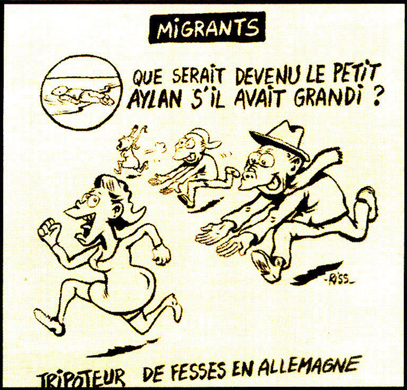 Μια "γελοιογραφία" του περιοδικού αναρωτιόταν μερικούς μήνες μετά τον τραγικό θάνατο του παιδιού "-Τί θα έκανε ο Aylan, αν δεν πνιγόταν;" και μέσω της εικόνας έδινε ταυτόχρονα και την απάντηση. Μάλλον... θα κυνηγούσε κώλους.