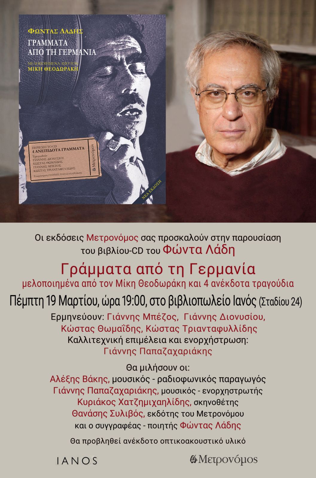 “Γράμματα από τη Γερμανία” – Μελοποιημένα από τον Μίκη Θεοδωράκη και 4 ανέκδοτα τραγούδια – Πέμπτη 19 Μαρτίου στο βιβλιοπωλείο “Ιανός”