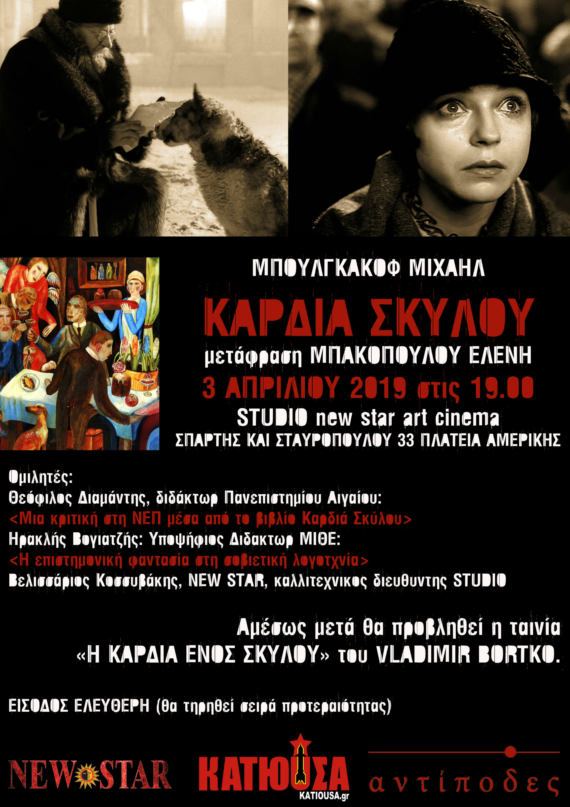Αυτό είναι το ερώτημα που βάζει ο συγγραφέας Μιχαήλ Μπουλγκάκοφ στην “καρδιά σκύλου” και η βασική αφορμή για να γίνει μια πολύ ενδιαφέρουσα συζήτηση για το ιστορικό πλαίσιο της εποχής. Θα ακολουθήσει η προβολή της κινηματογραφικής μεταφοράς του βιβλίου, που γίνεται σε πρώτη προβολή στην Ελλάδα.
