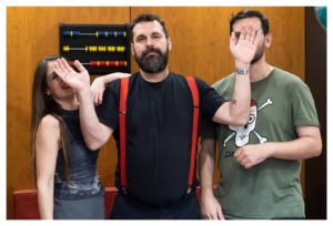 Αριστερά του, όπως κοιτάτε εσείς την σκηνή, θα είναι η Ελένη Ποζατζίδου στο τραγούδι. Απ’ την άλλη ο Γιάννης Ταυλάς με τα τραγούδια και όσα όργανα αντέχει να κουβαλήσει κάθε φορά.