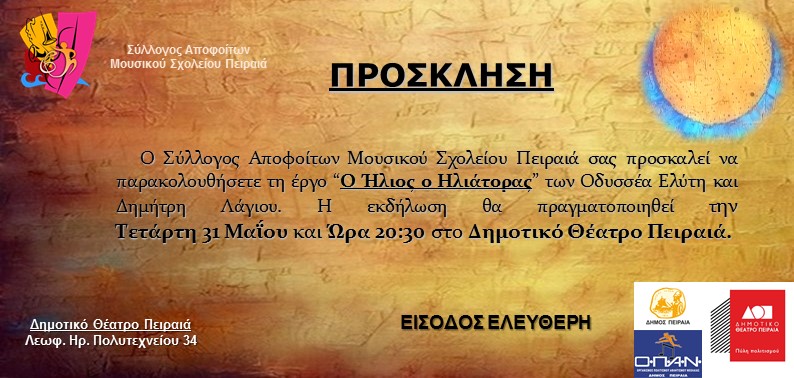 Ο Σύλλογος Αποφοίτων Μουσικού Σχολείου Πειραιά, στο πλαίσιο των πολιτιστικών δραστηριοτήτων του, παρουσιάζει το μουσικό έργο «Ο Ήλιος ο Ηλιάτορας».