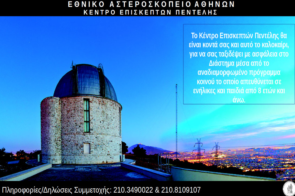 Το Κέντρο Επισκεπτών Πεντέλης του Εθνικού Αστεροσκοπείου Αθηνών μας περιμένει για να μας ταξιδέψει στο Διάστημα με το αναπροσαρμοσμένο πρόγραμμα Βραδινών Παραστάσεων Κοινού.