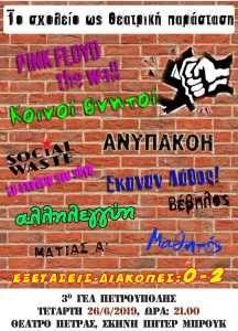 Την Τετάρτη 26/6/2019 στις 21:00, η θεατρική ομάδα των μαθητών του 3ου Γενικού Λυκείου Πετρούπολης, υπό την καθοδήγηση των υπεύθυνων καθηγητριών, παρουσιάζει το έργο “Το σχολείο ως θεατρική παράσταση” στο θέατρο Πέτρας, στη σκηνή Πήτερ Μπρουκ.
