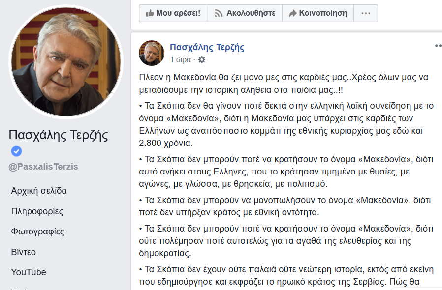 Όπως είναι γνωστό, η συμφωνία των Πρεσπών έχει διχάσει τον πνευματικό και καλλιτεχνικό κόσμο της χώρας, με κάποιους να συμμετέχουν μέσω υπογραφών σε κείμενα υπέρ ή κατά της συμφωνίας και με άλλους να προτιμούν να μη μοιράζονται τα φώτα της δημοσιότητας, διαφημίζοντας τις απόψεις τους στους προσωπικούς λογαριασμούς τους στα ΜΚΔ.