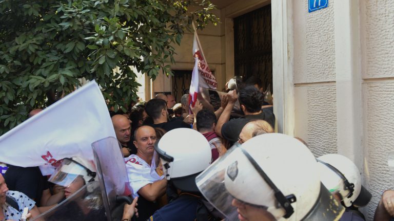 Τα ΜΑΤ διώχνουν τον κόσμο πετώντας χημικά και κλειδώνουν την πόρτα. Το λαϊκό κίνημα ανασυντάσσεται, σπάει τον κλοιό, και δείχνει τη δική του δύναμη. Όταν είναι μαζικό το λαϊκό κίνημα, γίνεται πανίσχυρο και δεν μπορεί να το σταματήσει κανείς.