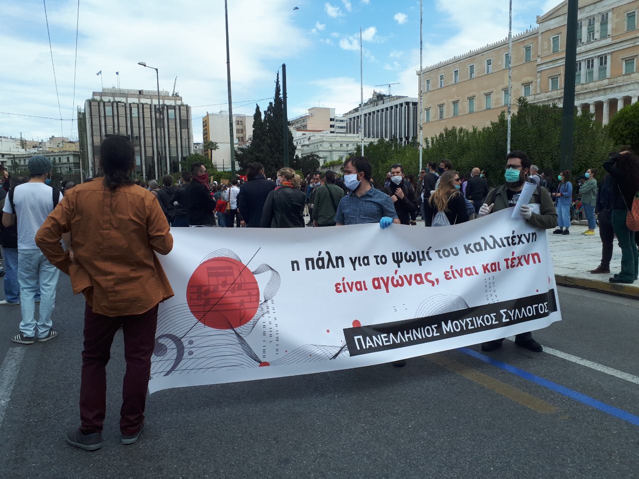 Τα πανό και τα συνθήματα ήταν πολύχρωμα και πολυποίκιλα, όπως “Σήμερα τραγουδάμε το πιο όμορφο τραγούδι απ’ όλα τα τραγούδια του αγώνα” από το Πανελλήνιο Σωματείο Ελλήνων Τραγουδιστών, “Εσύ είσαι κρίκος στην αλυσίδα” του ΣΕΗ, “Η πάλη για το ψωμί του καλλιτέχνη είναι αγώνας, είναι και τέχνη” του Πανελλήνιου Μουσικού Συλλόγου, “Όχι στην απαξίωση των καλλιτεχνών. Αποζημίωση στους εικαστικούς καλλιτέχνες” από το Επιμελητήριο Εικαστικών Τεχνών Ελλάδας. Στα μεγάφωνα, πολύ χαρακτηριστική ήταν η αποστροφή που υπογράμμισε πως “δε θα γυρίσουμε πίσω στην κανονικότητα της βαρβαρότητας”.