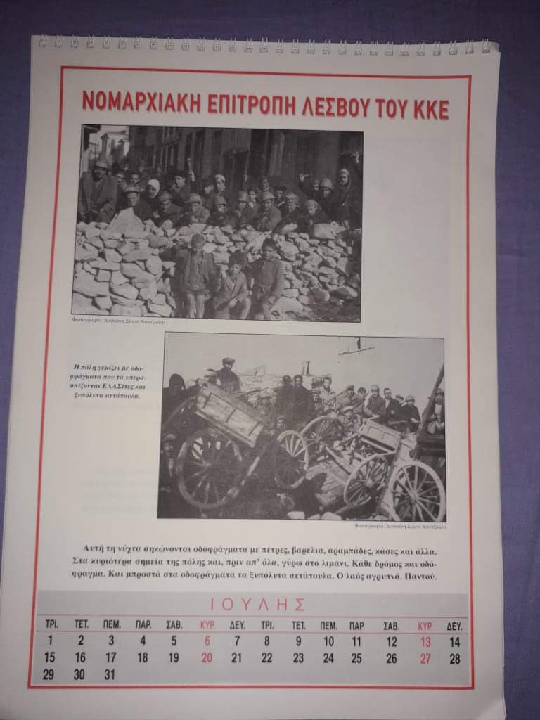 Οι πρώτες 14 φωτογραφίες είναι ολόκληρο το «ΗΜΕΡΟΛΟΓΙΟ 2003» της Ν.Ε. Λέσβου του ΚΚΕ, του 2003. Ήταν η πρώτη φορά που δημοσιεύτηκαν. Διαβάζοντας τα σχόλια κάτω από τις φωτογραφίες, έχετε άλλη μια αφήγηση των γεγονότων, από το βιβλίο «Ντοκουμέντα του Ελληνικού Προοδευτικού Κινήματος. ΜΥΤΙΛΗΝΗ. ΧΡΙΣΤΟΥΓΕΝΝΑ 1944 ή πώς εμποδίστηκε η απόβαση των Εγγλέζων». Έκδοση Ελεύθερη Λέσβος, Μυτιλήνη, Μάρτης 1945.