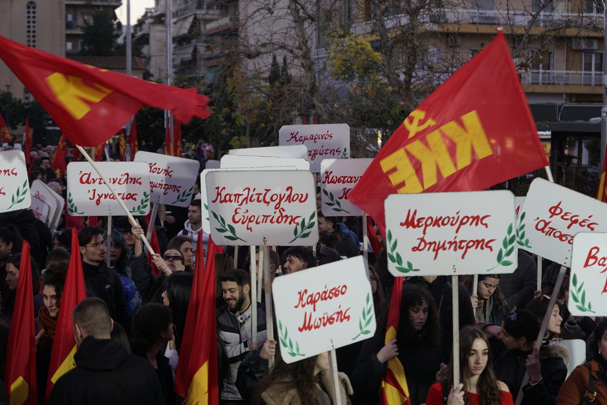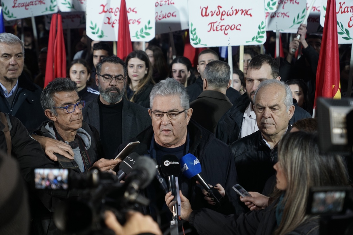 Μέσα σε συνθήματα ο γραμματέας της ΚΕ του ΚΚΕ Δημήτρης Κουτσούμπας και ο γραμματέας του ΚΣ της ΚΝΕ Θοδωρής Κωτσαντής καταθέτουν λίγα λουλούδια..