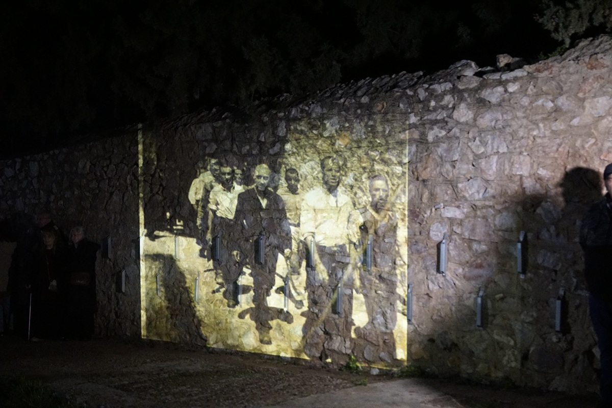 Τη στιγμή που η πορεία περνά τον στενό διάδρομο προς τον τόπο της εκτέλεσης, η συγκίνηση αποτυπώνεται στα σφιγμένα χείλη. Από τα μεγάφωνα φτάνουν τα τελευταία λόγια των εκτελεσμένων, μέσα από τα δικά τους τελευταία σημειώματα. Και φτάνοντας εκεί, οι φωτογραφίες από τη μέρα της εκτέλεσης προβάλλονται στον τοίχο, ζωντανεύουν τα Πρόσωπα στη θέση που βρέθηκαν, «στο θάνατο ατρόμητοι με βλέμμα καθαρό», αλύγιστοι, αθάνατοι.