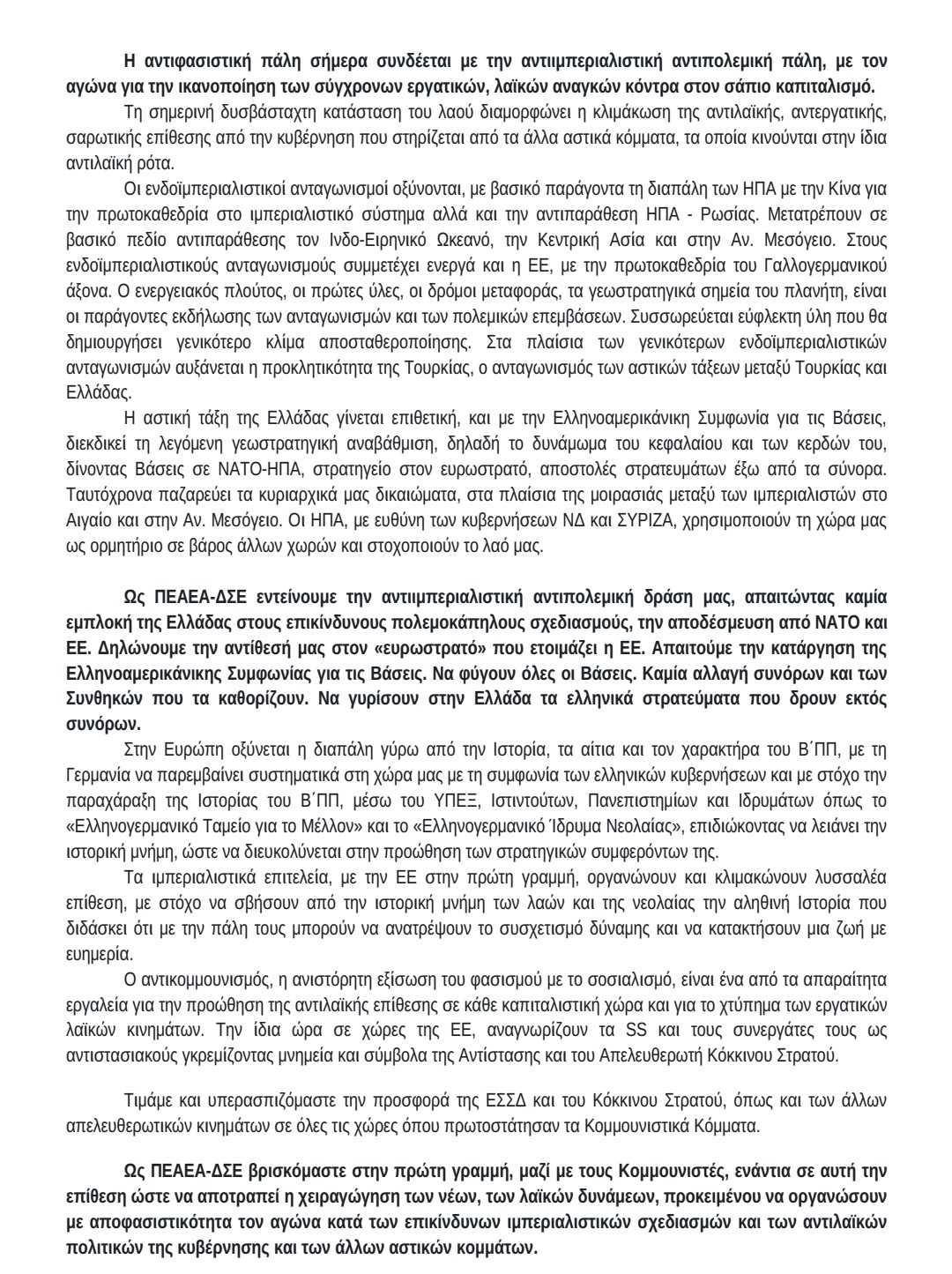 Φόρο τιμής σε όσους και όσες έδωσαν τη ζωή τους ή έμειναν ανάπηροι στα πεδία των μαχών, είτε μάτωσαν στις φυλακές και τις εξορίες αγωνιζόμενοι για την απελευθέρωση της Ελλάδας από τους φασίστες, για τη συντριβή του φασιστικού ιμπεριαλισμού αποτίει η Πανελλήνια Ένωση Αγωνιστών Εθνικής Αντίστασης και Δημοκρατικού Στρατού Ελλάδας με αφορμή τη συμπλήρωση 80 χρόνων από την ίδρυση του Εθνικού Απελευθερωτικού Μετώπου (ΕΑΜ). Στην ανακοίνωσή της σημειώνονται τα εξής: