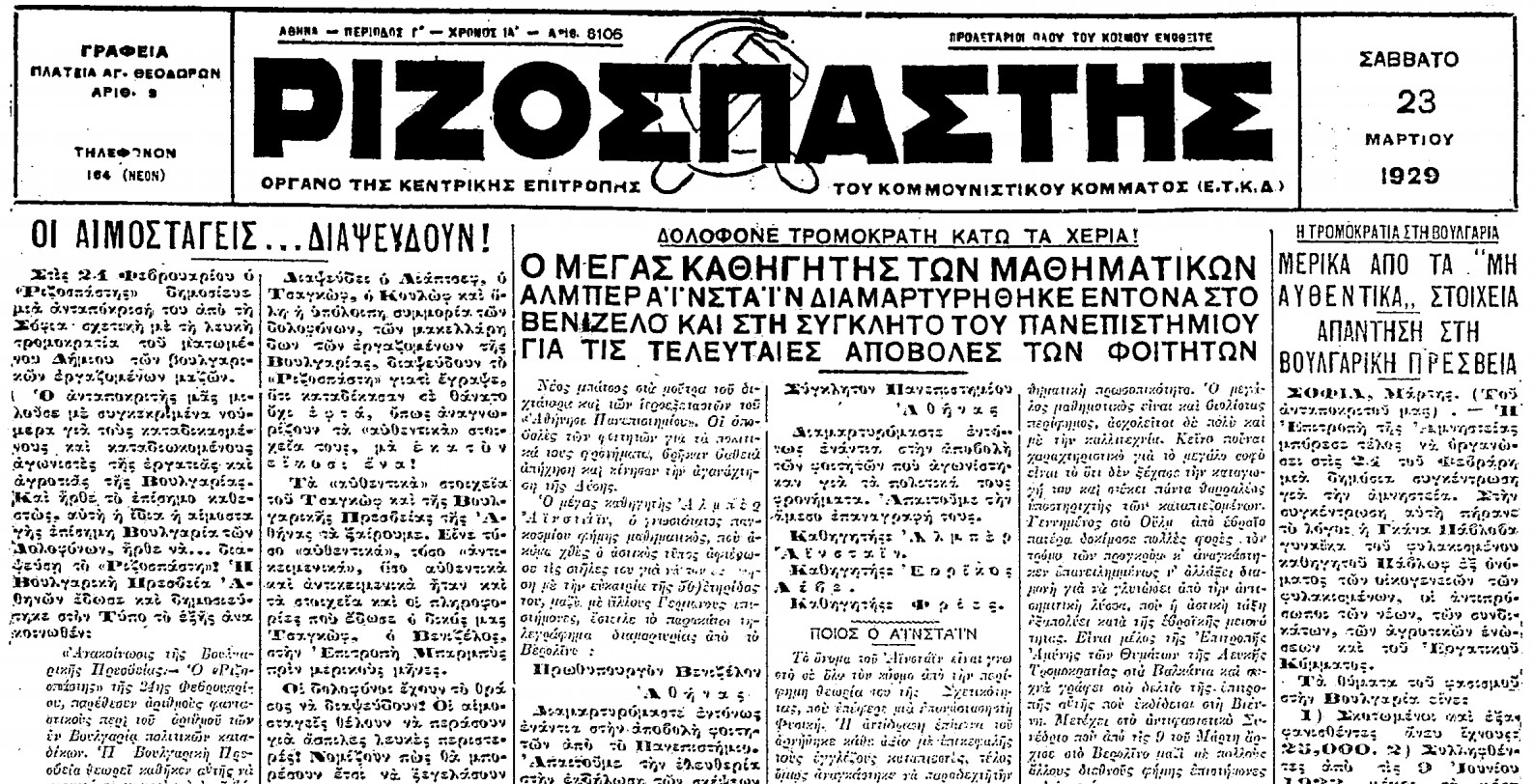 Σαν σήμερα, στις 23 του Μάρτη 1929, δημοσιεύεται στην πρώτη σελίδα του Ριζοσπάστη τηλεγράφημα του Άλμπερτ Αϊνστάιν προς την κυβέρνηση Βενιζέλου, με το οποίο ο μεγάλος επιστήμονας, που ήταν και μέλος της Επιτροπής Αμύνης των Θυμάτων της Λευκής (αστικής) Τρομοκρατίας στα Βαλκάνια, διαμαρτυρόταν για την αποβολή πέντε φοιτητών από το Πανεπιστήμιο της Αθήνας, λόγω των πολιτικών τους πεποιθήσεων.