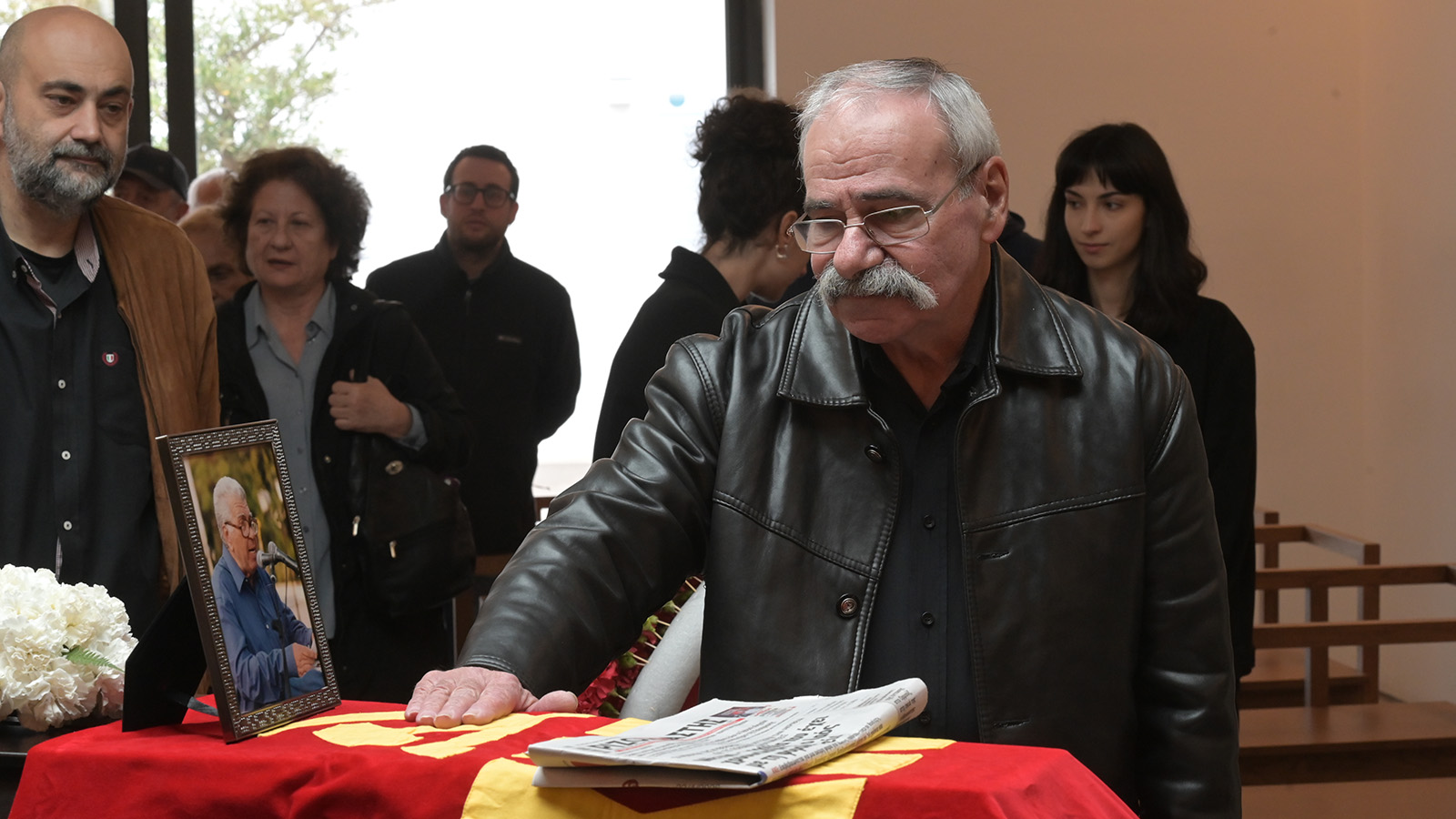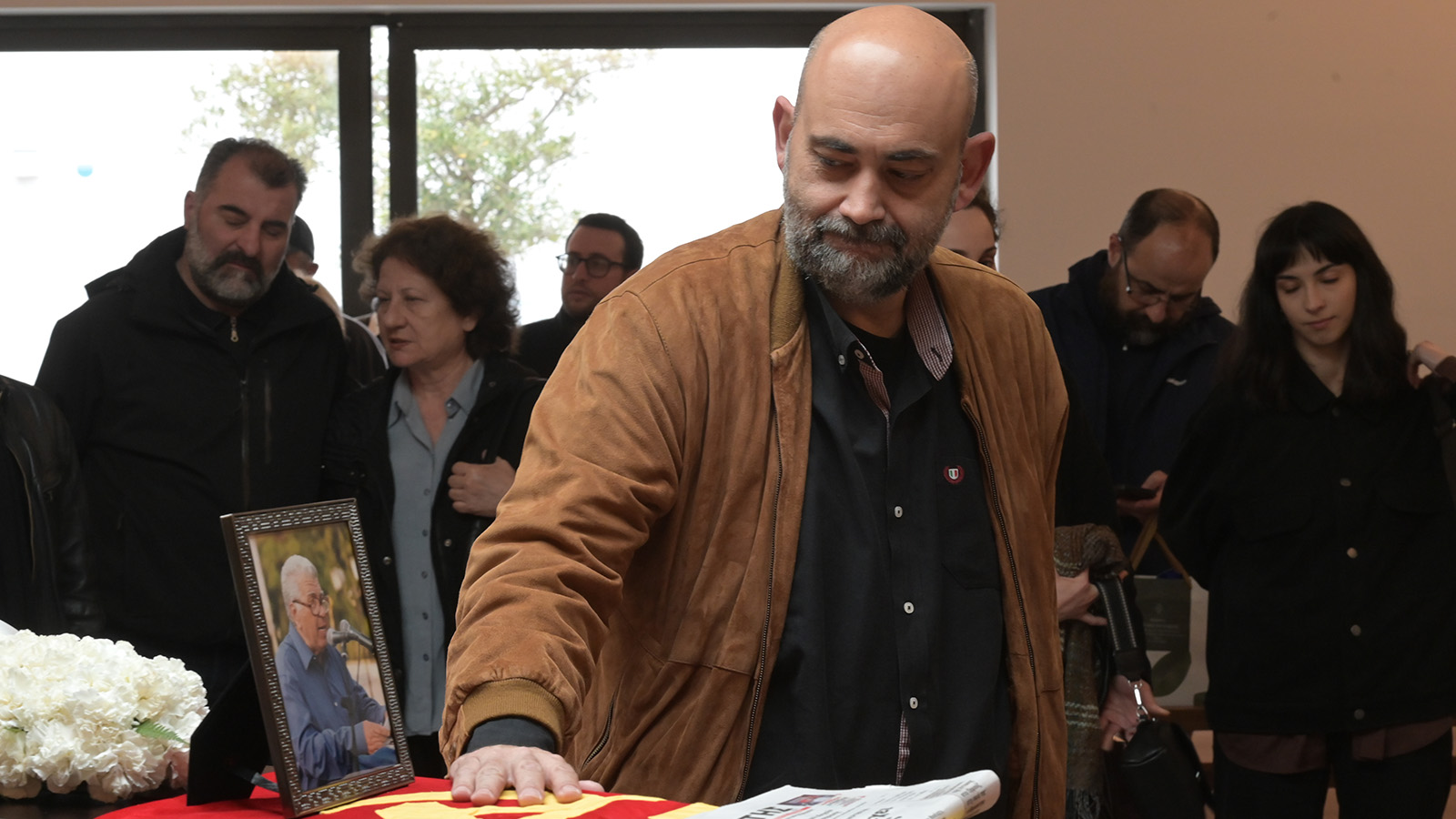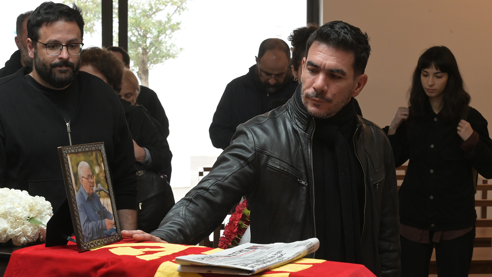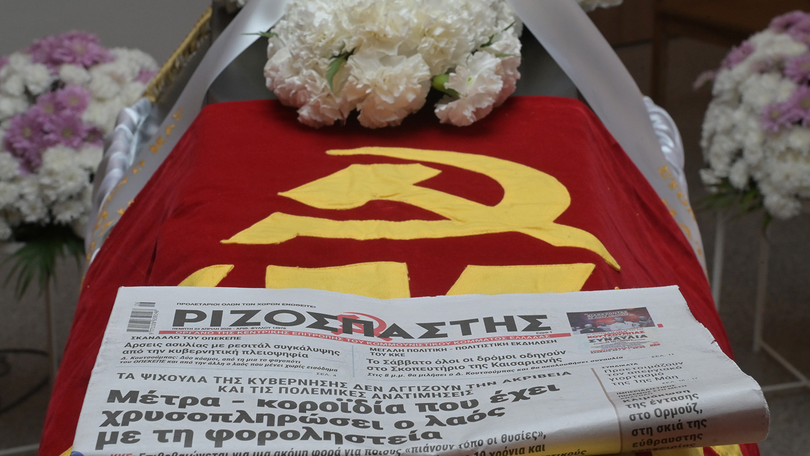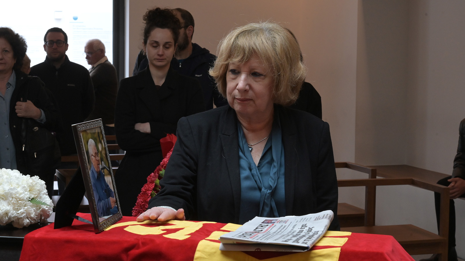 Στο πλευρό του ως τιμητική φρουρά δίπλα στο σκεπασμένο φέρετρο με τις σημαίες του ΚΚΕ και της ΕΑΜικής Αντίστασης και ακουμπισμένο τον «Ριζοσπάστη», στάθηκαν σύντροφοι και συντρόφισσες από το ΚΚΕ και την ΚΝΕ, συνοδεύοντας τον στο ύστατο χαίρε.
