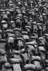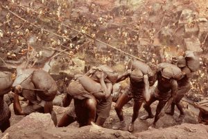 Οι εργάτες ήταν υποχρεωμένοι να μεταφέρουν στην πλάτη τους εξήντα τέτοια σακιά, ανεβοκατεβαίνοντας σ’ ένα ιλιγγιώδες λασπωμένο βάραθρο από πρωτόγονες ξύλινες σκάλες ή ανεβαίνοντας τις λασπωμένες πλαγιές με τα πόδια.