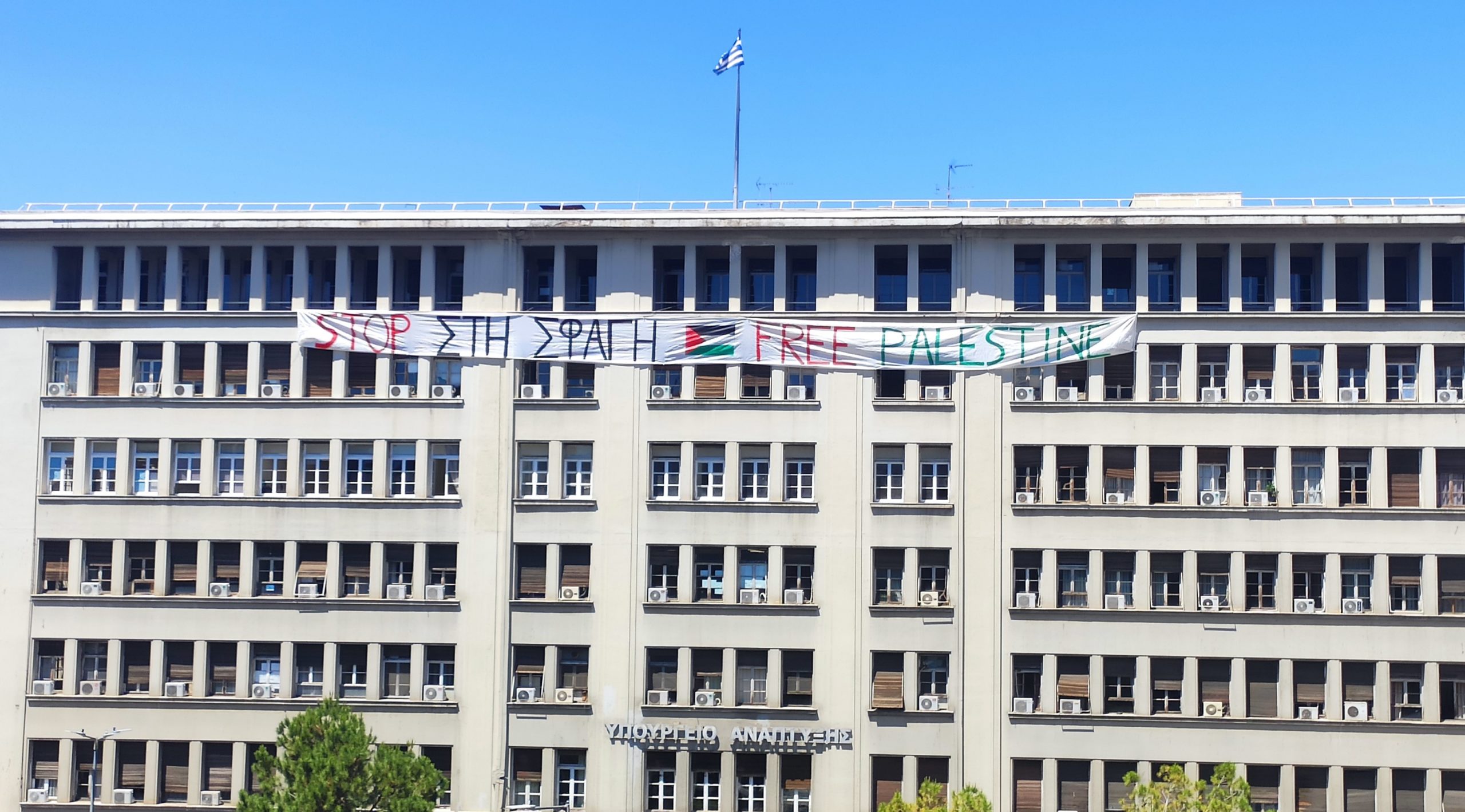Από τη μία η πολιτική ηγεσία, ο Υπουργός Ανάπτυξης και ο Πρωθυπουργός, αλλά και όλη η κυβέρνηση της Νέας Δημοκρατίας συντάσσονται με το κράτος-δολοφόνο του Ισραήλ και τις σφαγές αμάχων και παιδιών στην Παλαιστίνη. Δίνουν γη και ύδωρ στους φονιάδες και άμα λάχει, δίνουν και το κτίριο του Υπουργείου στην Κάνιγγος για να γυριστεί Ισραηλινό σήριαλ που διαδραματίζεται στο Ιράν.