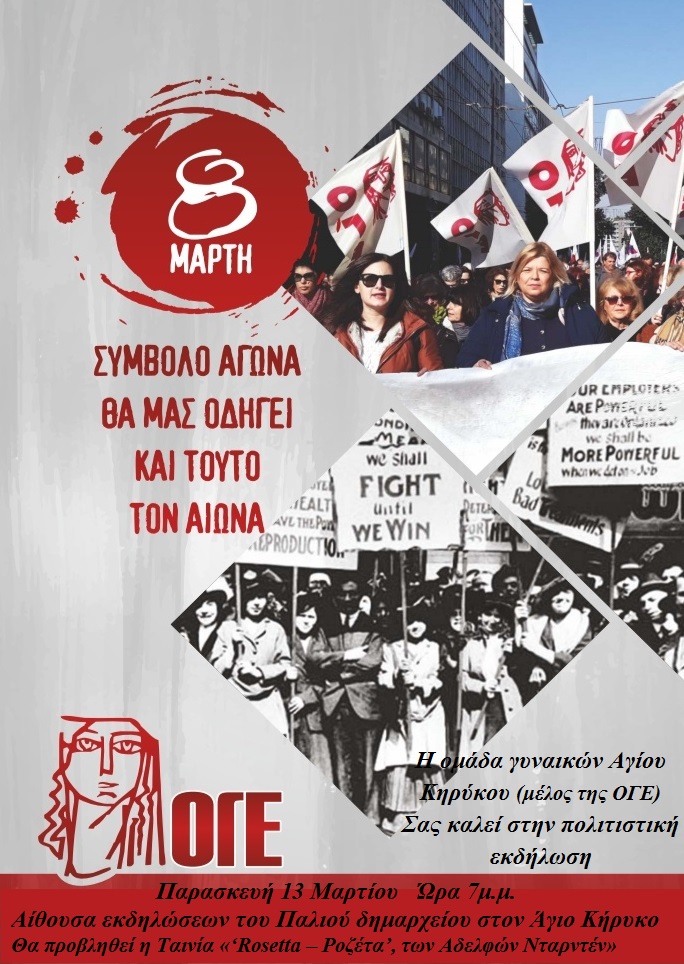1. Κυριακή 8 Μάρτη, αίθουσα πολιτιστικού κέντρου Χριστού Ραχών, 7 μ.μ (ΕΝΩΣΗ ΔΗΜΟΚΡΑΤΙΚΩΝ ΓΥΝΑΙΚΩΝ ΙΚΑΡΙΑΣ)
