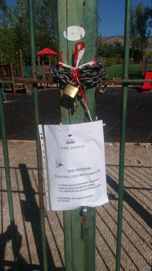 Μετά τις εγκαταστάσεις του αυτόματου ποτίσματος σε πλατείες και άλλους δημόσιους χώρους, οι βάνδαλοι στο Χαϊδάρι έβαλαν τώρα στο μάτι τις παιδικές χαρές του Δήμου. Σύμφωνα με τη Δημοτική Αρχή η εφευρετικότητα των βανδάλων είναι ανεξάντλητη, και εκτείνεται από μερική καταστροφή μέχρι ολική αφαίρεση οργάνων.