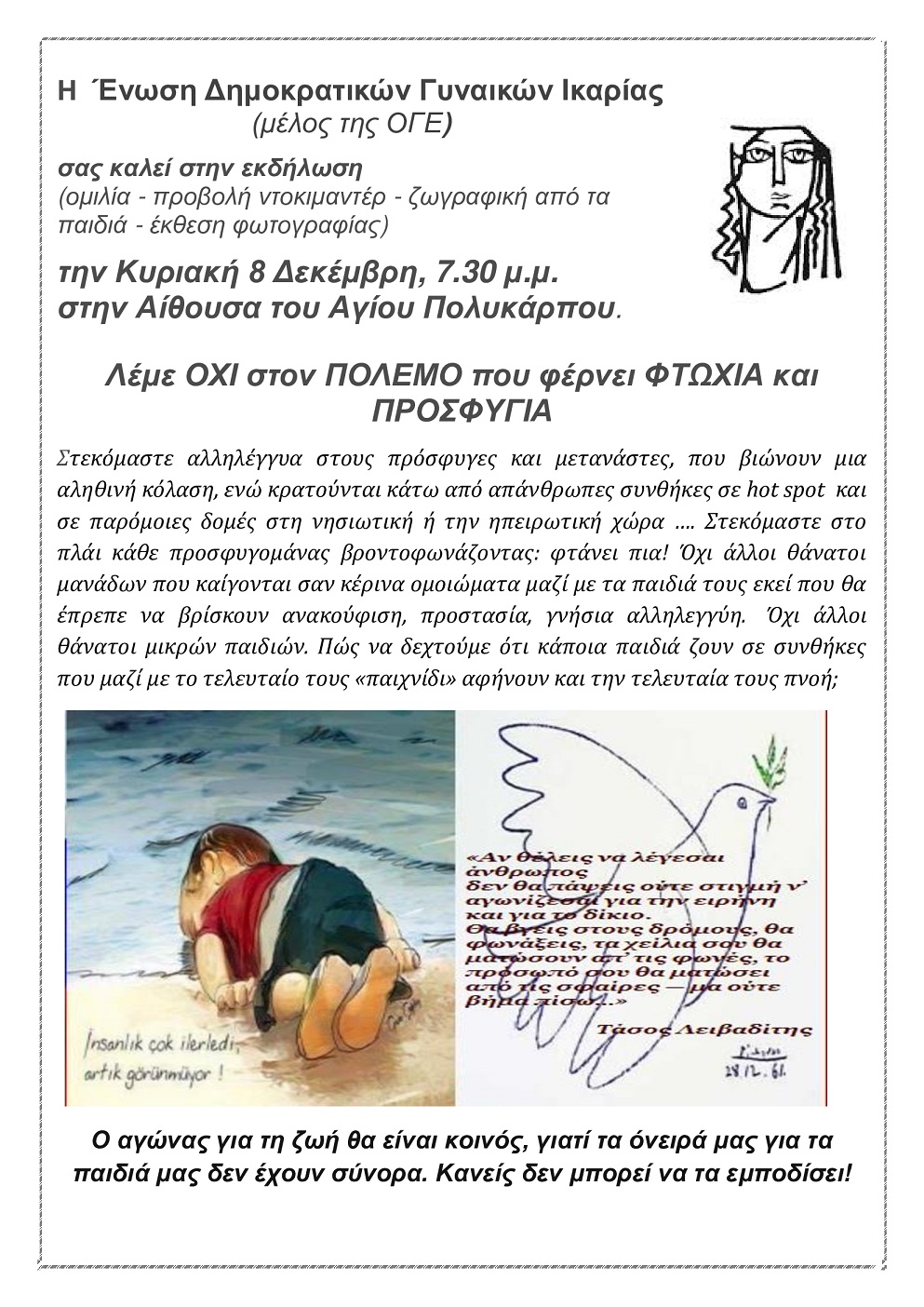 Η Ένωση Δημοκρατικών Γυναικών Ικαρίας (μέλος της ΟΓΕ) διοργανώνει εκδήλωση με θέμα «Λέμε ΟΧΙ στον ΠΟΛΕΜΟ που φέρνει ΦΤΩΧΙΑ και ΠΡΟΣΦΥΓΙΑ» (ομιλία – προβολή ντοκιμαντέρ – ζωγραφική από τα παιδιά – έκθεση φωτογραφίας), την Κυριακή 8 Δεκέμβρη, 7.30 μ.μ. στην Αίθουσα του Αγίου Πολυκάρπου.