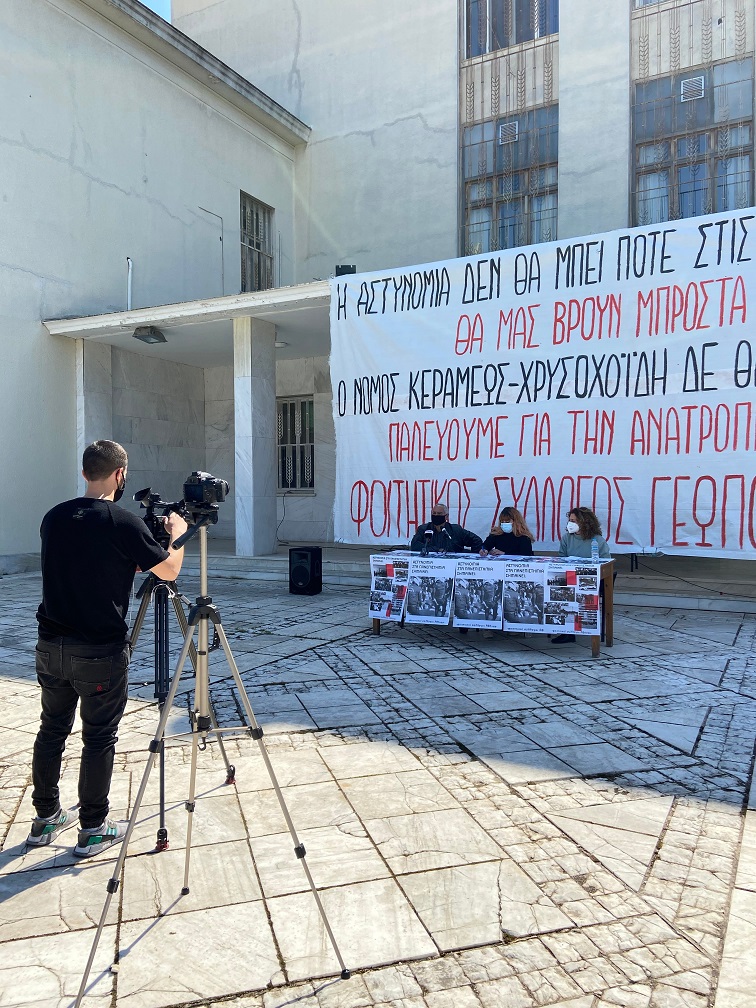 Την Παρασκευή 2 Απρίλη 2021 πραγματοποιήθηκε κοινή συνέντευξη τύπου του φοιτητικού συλλόγου Γεωπονικής μαζί με το σύλλογο Διοικητικών του πανεπιστημίου για την εφαρμογή του νόμου Κεραμέως-Χρυσοχοΐδη. Με βάση τις δηλώσεις του τελευταίου μέχρι το τέλος του μήνα θα εισβάλουν στα Πανεπιστήμια δυνάμεις καταστολής που θα αποτελούνται από αστυνομικούς διαφόρων σωμάτων (ΜΑΤ, ΔΡΑΣΗ κλπ) για να ξεκινήσει η εφαρμογή- υλοποίηση του νόμου ήδη από τώρα, όσο οι σχολές παραμένουν κλειστές. Στη συνέντευξη συμμετείχαν και τοποθετήθηκαν μέλη του φοιτητικού συλλόγου, η πρόεδρος του συλλόγου Διοικητικών του ΓΠΑ Νίκη Χρονοπούλου και εργαζόμενοι στη φύλαξη του Πανεπιστημίου.
