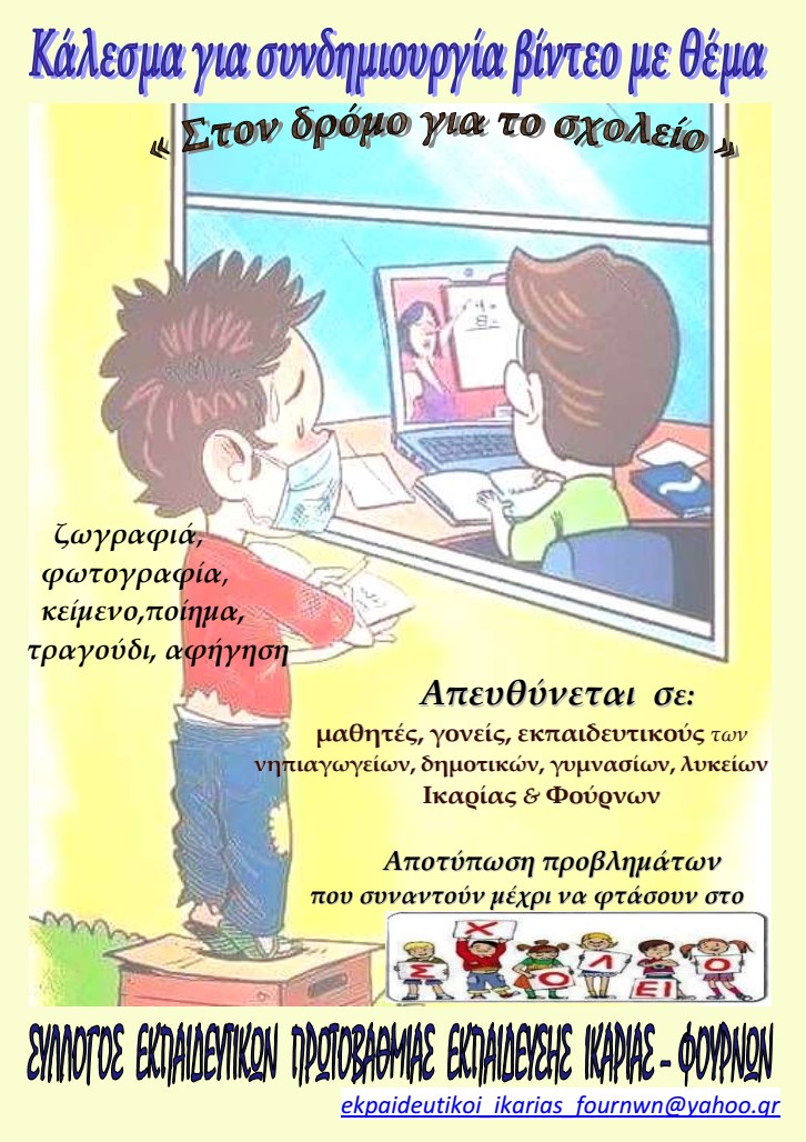 Ο Σύλλογος Εκπαιδευτικών Πρωτοβάθμιας Εκπαίδευσης Ικαρίας-Φούρνων απευθύνει κάλεσμα για συνδημιουργία βίντεο με θέμα «Στον δρόμο για το σχολείο», σημειώνοντας τα εξής: