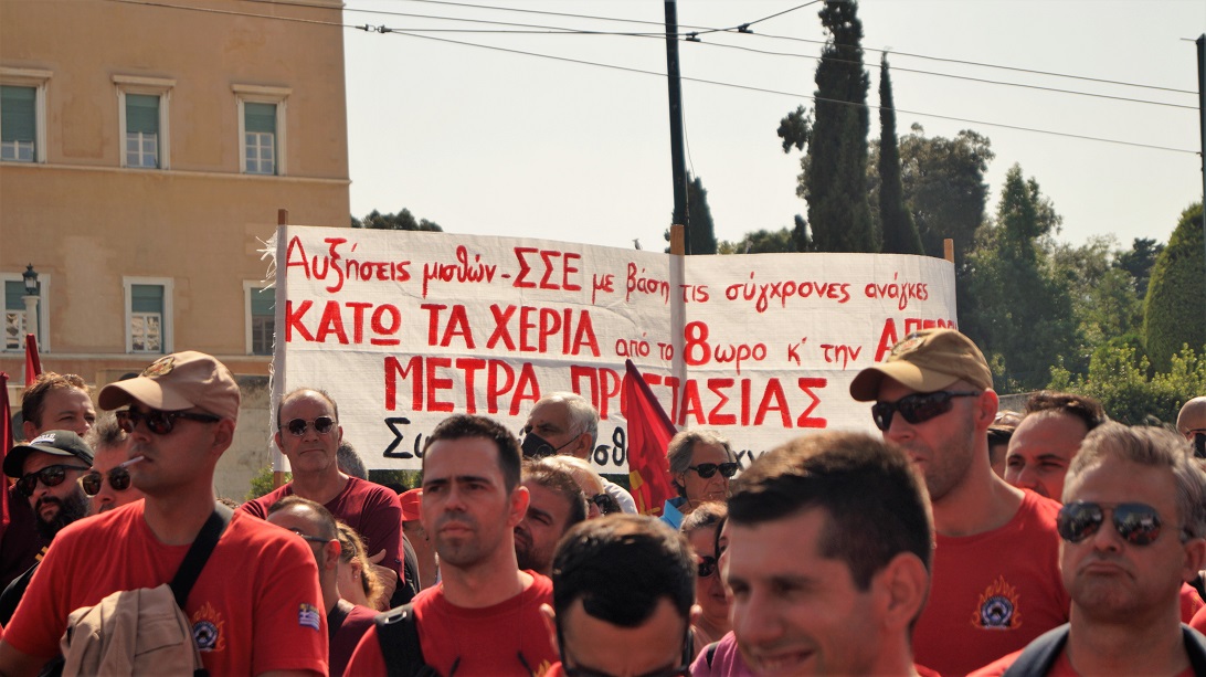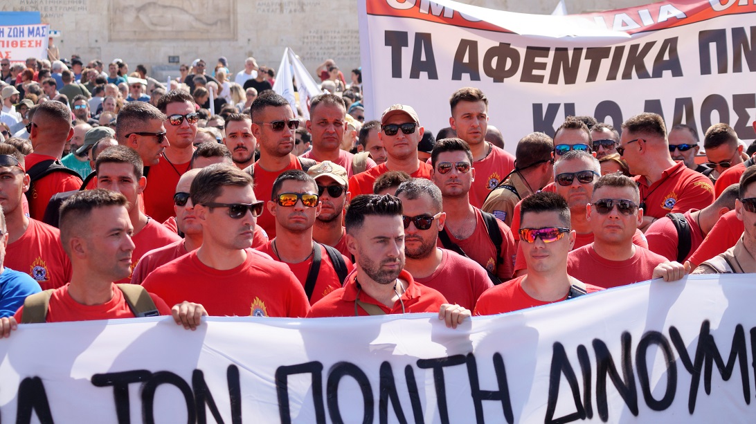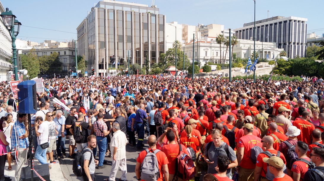Στιγμιότυπα από το μεγάλο απεργιακό συλλαλητήριο στο Σύνταγμα, όπου μεταξύ άλλων ξεχώρισε με την μαχητική παρουσία του το μπλοκ των συμβασιούχων πυροσβεστών