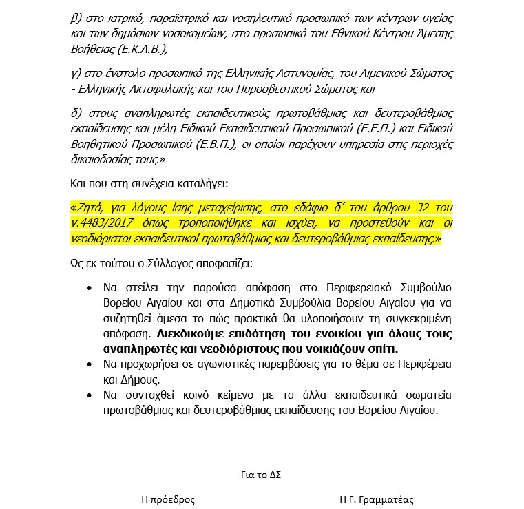 Να σημειωθεί ότι έχει γίνει μια πρώτη συζήτηση στο Περιφερειακό συμβούλιο Β. Αιγαίου με θετική ματιά και εκκρεμεί τελεσίδικη και αποφασιστική συζήτηση, η Περιφέρεια Ιονίων νήσων διαθέτει 400 ευρώ το μήνα ανά αναπληρωτή εκπαιδευτικό, όπως επίσης να έχουμε υπόψη ότι ο δήμος διαθέτει τους ξενώνες στο κολυμβητήριο , των οποίων η χρήση πρέπει να γίνει πιο ουσιαστική.