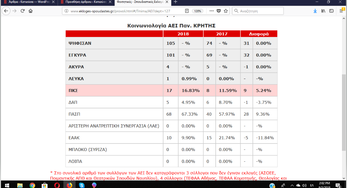 Στην Κοινωνιολογία στο Πανεπιστήμιο της Κρήτης, η “αριστερή ηγεμονία” είναι ξεκάθαρη με την ΠΑΣΠ να παίρνει δύο στους τρεις ψήφους και τη ΔΑΠ να περιορίζεται σε πέντε ψήφους και αντίστοιχο ποσοστό.