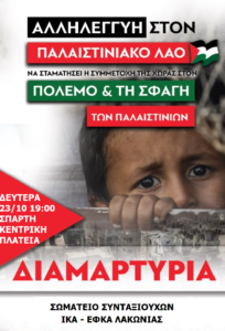 Αλληλεγγύη στον Παλαιστινιακό Λαό – Να σταματήσει η συμμετοχή της χώρας μας στον πόλεμο και στη σφαγή των Παλαιστινίων