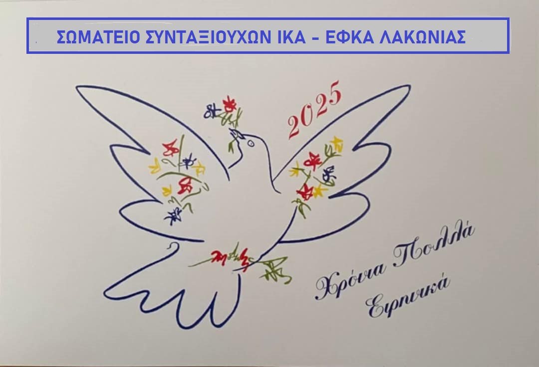 Το Διοικητικό Συμβούλιο του Σωματείου Συνταξιούχων ΙΚΑ-ΕΦΚΑ Λακωνίας, εύχεται σε όλους τους συνταξιούχους και συμπατριώτες του νομού μας χρονιά πολλά, με υγεία, αγωνιστικό και ειρηνικό το 2025.