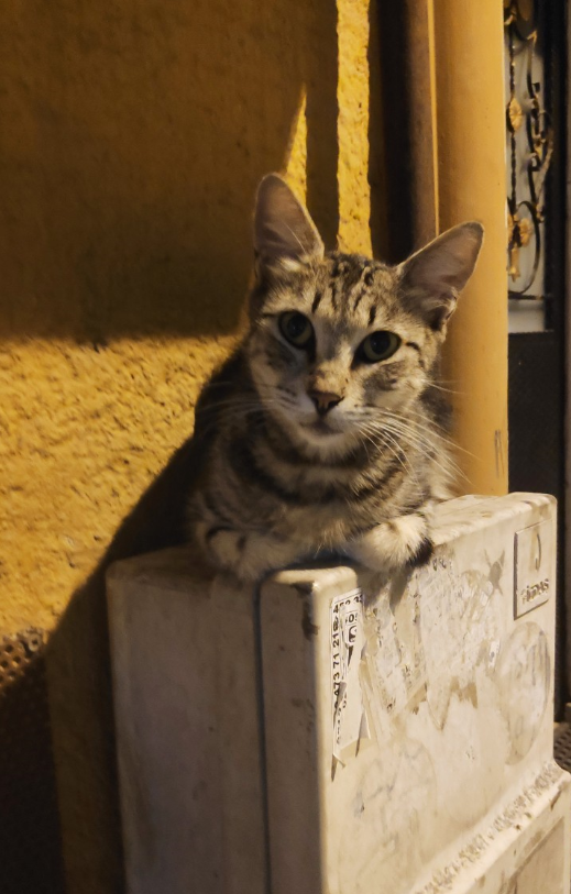 Το γατί κοιτούσε με απορία και ταυτόχρονα με απάθεια, όπως μόνο οι γάτες μπορούν να κοιτάζουν. Αυτοκρατορική στάση, φαινόταν πως ταράξαμε λίγο την ησυχία του. Ήταν το πρώτο.
