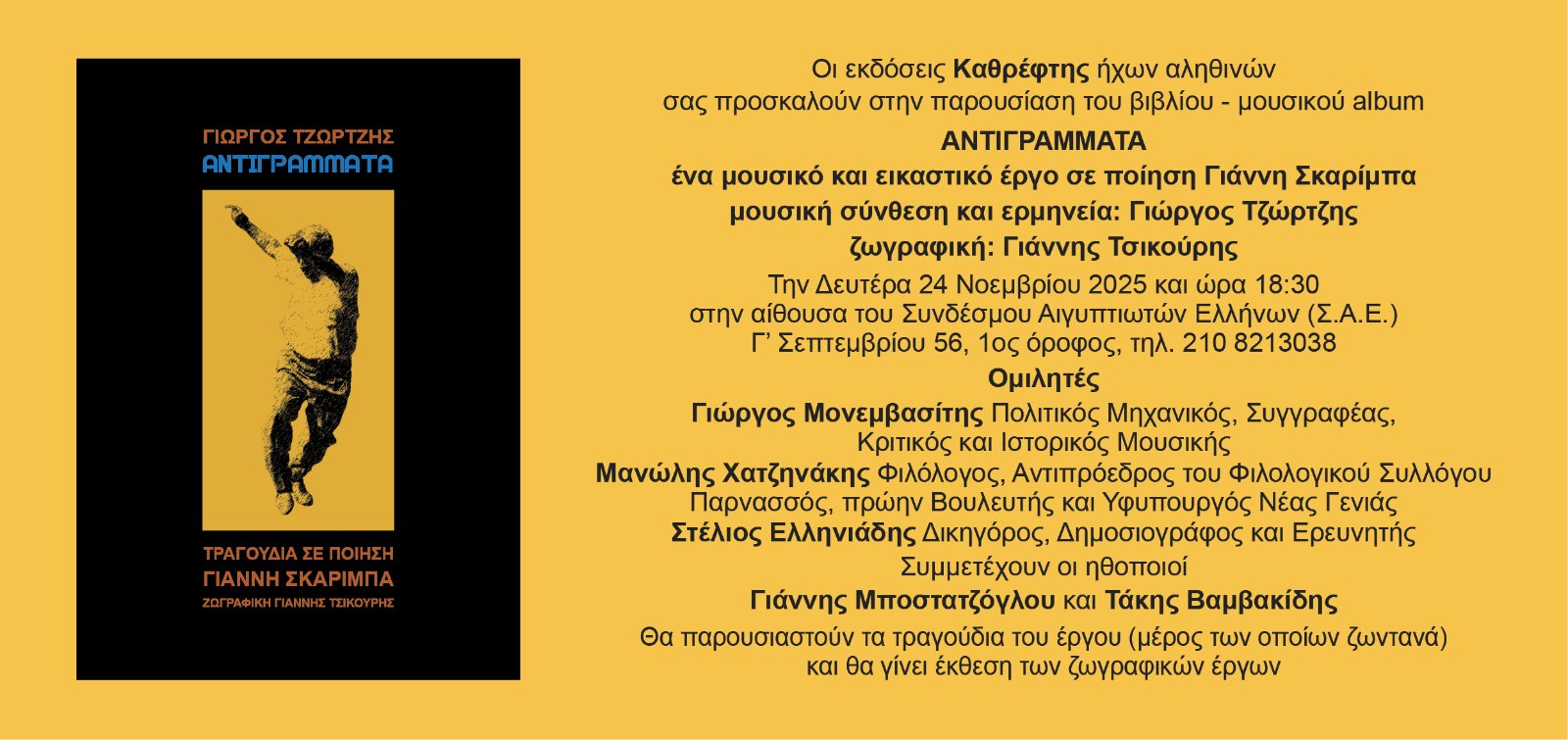 Οι εκδόσεις «Καθρέφτης ήχων αληθινών» παρουσιάζουν το βιβλίο – μουσικό άλμπουμ με τίτλο «“Αντιγράμματα” –  Ένα μουσικό και εικαστικό έργο σε ποίηση Γιάννη Σκαρίμπα». Μουσική σύνθεση και ερμηνεία: Γιώργος Τζώρτζης. Ζωγραφική: Γιάννης Τσικούρης.