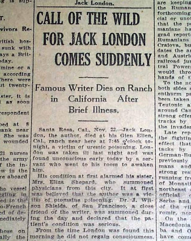 Ο Τύπος της 23 Νοέμβρη 1916 αναγγέλλει τον ξαφνικό θάνατο του Τζακ Λόντον