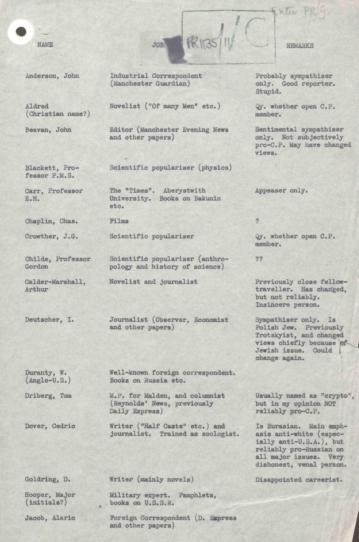 Ο Τζορτζ Όργουελ λοιπόν παρέδωσε το 1949 στις Βρετανικές μυστικές υπηρεσίες, μια λίστα με 38 ονόματα, υπόπτων για συμπάθεια στον κομμουνισμό, ή κρυφοκομμουνισμό, ή φιλικά διακείμενους απέναντι στο “καθεστώτος της Ρωσίας του Στάλιν”.