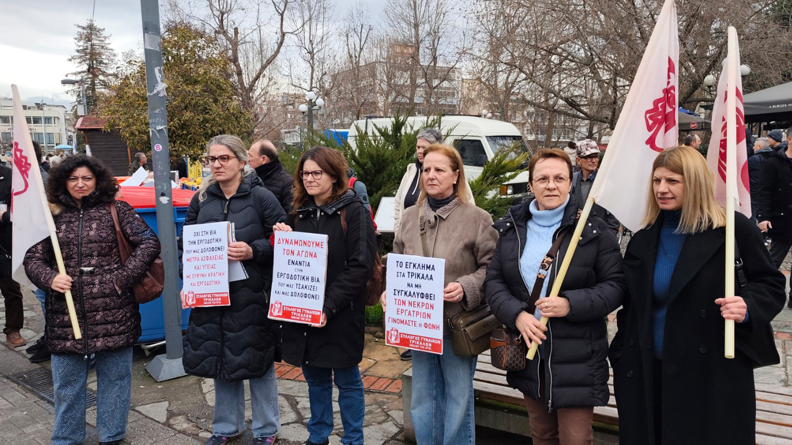 Με τους στίχους αυτού του τραγουδιού ξεκίνησε η απεργιακή συγκέντρωση του Εργατικού Κέντρου Τρικάλων για το εργοδοτικό έγκλημα που έγινε χθες στη βιομηχανία «Βιολάντα» και κόστισε τις ζωές πέντε εργατριών που βρήκαν φριχτό θάνατο στην μάχη για το μεροκάματο.