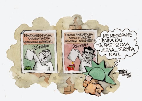 25. ΕΟΚ και ΝΑΤΟ το ίδιο συνδικάτο. Κατά συνέπεια, φεύγουν οι βάσεις, που μένουν, που φεύγουν. Κι ο λαός να κατεβαίνει στους δρόμους να πανηγυρίζει -όπως έκανε τώρα με το δημοψήφισμα του ΣΥΡΙΖΑ.