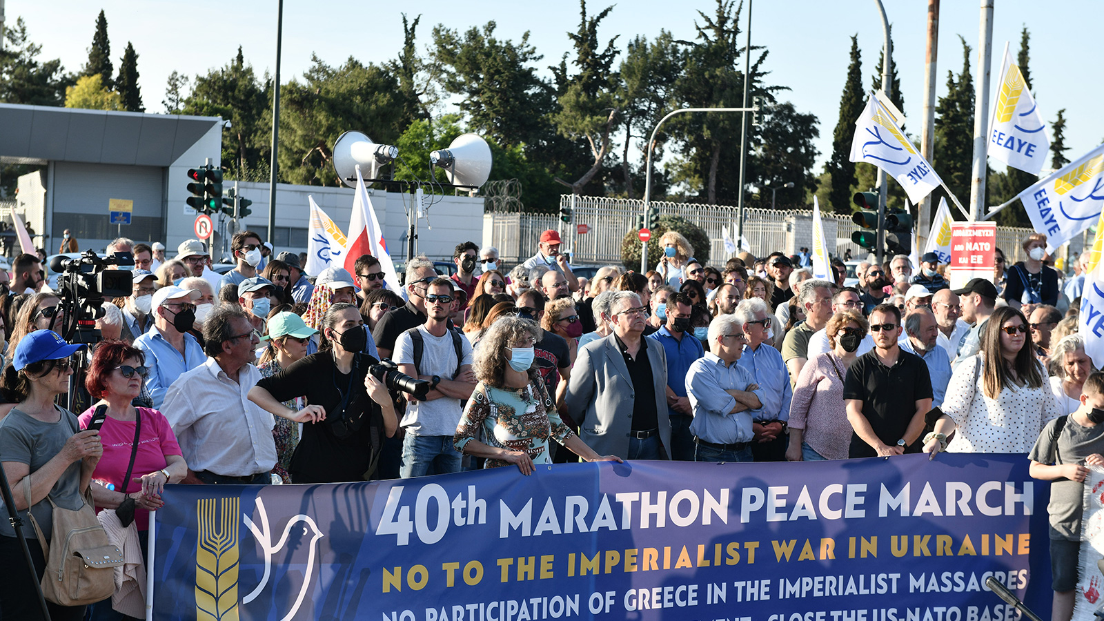 Μεγάλη συγκέντρωση διοργανώθηκε αργά το απόγευμα της Κυριακής στο υπουργείο Αμυνας όπου νωρίτερα κατέληξε η 40η Μαραθώνια Πορεία Ειρήνης που ξεκίνησε στις 8 το πρωί από τον Τύμβο του Μαραθώνα μεταφέροντας το μήνυμα της εναντίωσης στον ιμπεριαλιστικό πόλεμο, στην ελληνική συμμετοχή σε αυτόν και στην εμπλοκή της χώρας στα επικίνδυνα σχέδια των ΝΑΤΟικών.