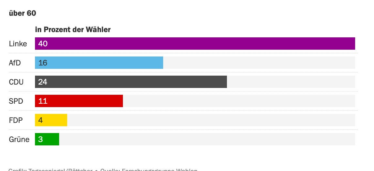 Μεγαλύτερο ενδιαφέρον όμως έχει η ηλικιακή ανάλυση της ψήφου. Εκεί διακρίνεται ξεκάθαρα, ότι οι άνω των 60, δηλαδή όσοι ήταν 30 ετών και πάνω κατά την πτώση του τείχους και μεγάλωσαν στο σοσιαλισμό, προκρίνουν με μεγάλη διαφορά το κόμμα που στη συνείδησή τους θεωρείται διάδοχος του Ενιαίου Σοσιαλιστικού Κόμματος, κάτι που ισχύει τυπικά, παρότι οι φορείς του πατούν σταθερά σε δυο βάρκες μεταξύ μισόκαρδης υπεράσπισης και ανοιχτής δυσφήμισης της ΓΛΔ. Ακόμα πιο σημαντικό είναι το γεγονός πως η Εναλλακτική για τη Γερμανία έρχεται με μεγάλη διαφορά στην τρίτη θέση, με ποσοστό 16%, πολύ κάτω από το μέσο όρο στο κρατίδιο. Αντιθέτως, στις ηλικίες κάτω των 30, που δεν έχουν κανένα άμεσο βίωμα από το σοσιαλισμό, αλλά αντίθετα διαπαιδαγωγήθηκαν στην ιδέα πως η ΓΛΔ ήταν ένα “κράτος αδίκου” (Unrechtsstaat) κι έχουν φάει εξ απαλών ονύχων με το κουτάλι τη θεωρία της εξίσωσης των δύο άκρων, η Εναλλακτική έρχεται πρώτο κόμμα με 24%, ενώ ενδιαφέρον παρουσιάζει και η υπερδιπλάσια απήχηση των “φιλελέφτ” πρασίνων σε σχέση με το συνολικό τους ποσοστό (11% έναντι 5%), αλλά και η αυξημένη επίσης επιρροή των νεοφιλελεύθερων με 8% έναντι 5% συνολικά στο κρατίδιο. Περιττό να πούμε ότι στις ηλικίες άνω των εξήντα, αμφότερα τα κόμματα αυτά βρίσκονται σαφώς κάτω από το τοπικό τους ποσοστό.