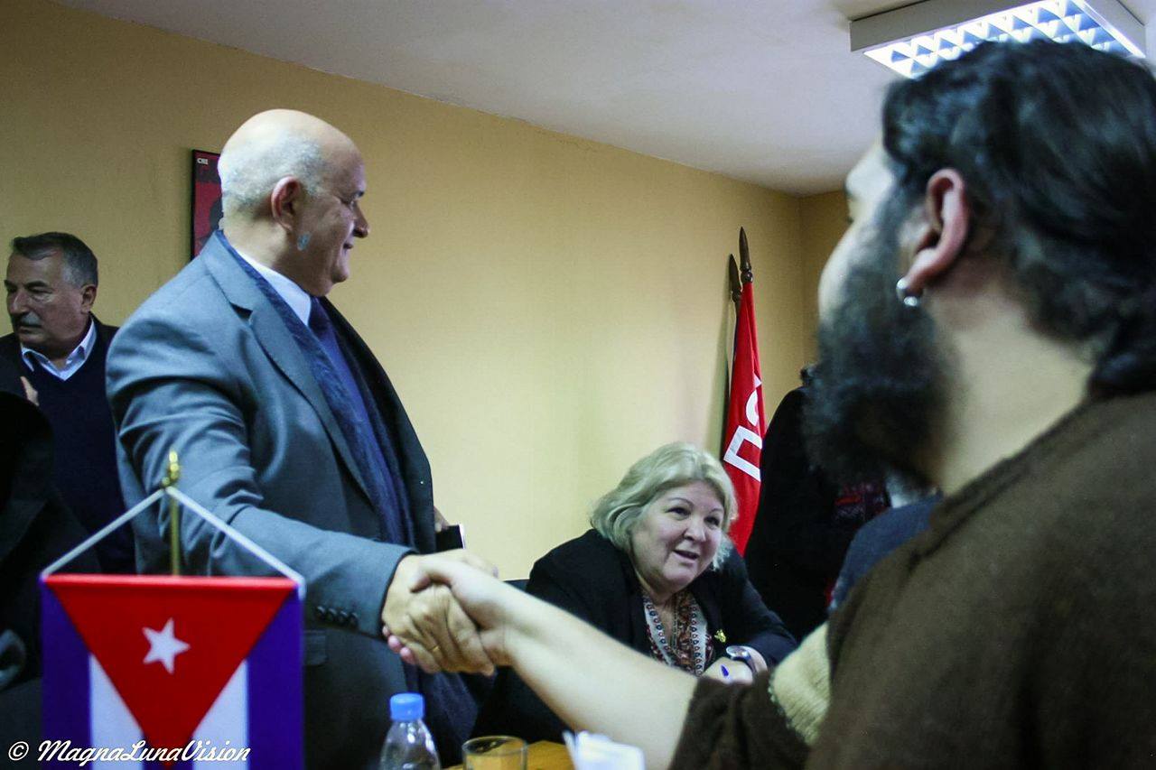 Ο Πρόεδρος της ΚΕ της Ένωσης Κομμουνιστών Βουλγαρίας και του Κομμουνιστικού Κινήματος «Τσε Γκεβάρα», Πάβελ Ιβανόβ, με την σημαία του Κόμματος του που φέρει τη μορφή του Τσε. Η Αλέιδα βάζει την υπογραφή της στη σημαία