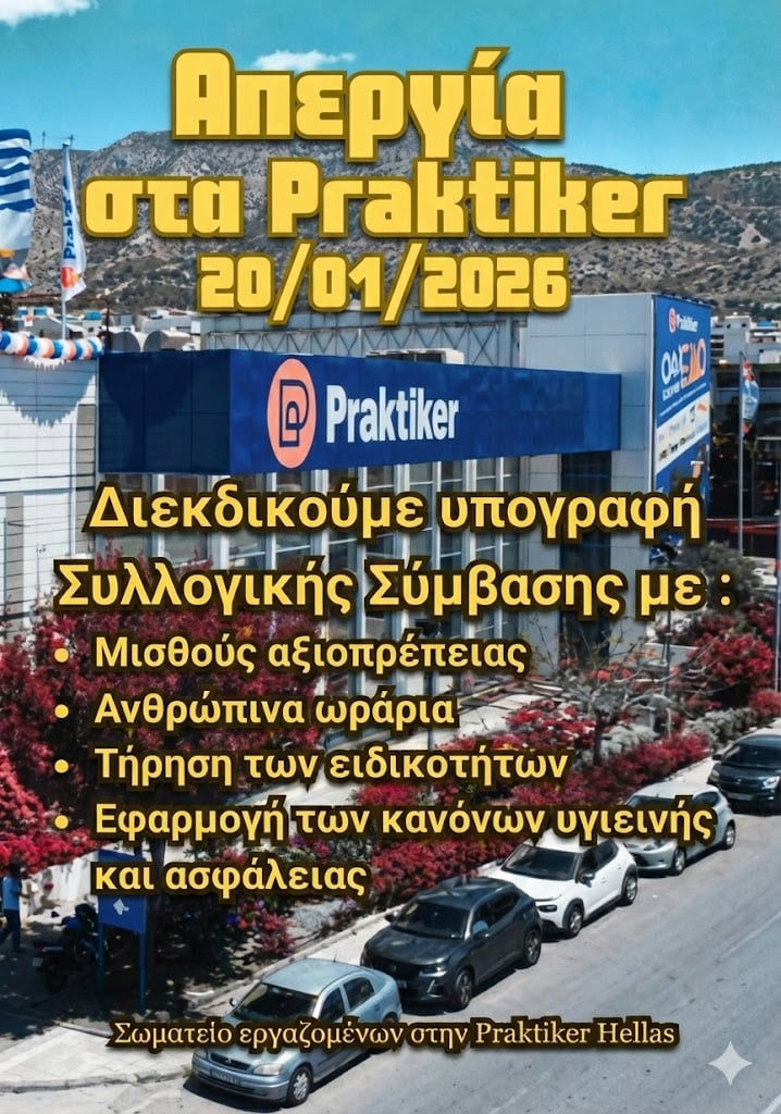 Το Σωματείο Εργαζομένων στην Praktiker Hellas ανακοινώνει τη διεξαγωγή 24ωρης πανελλαδικής απεργίας την Τρίτη 20 Ιανουαρίου 2026.
