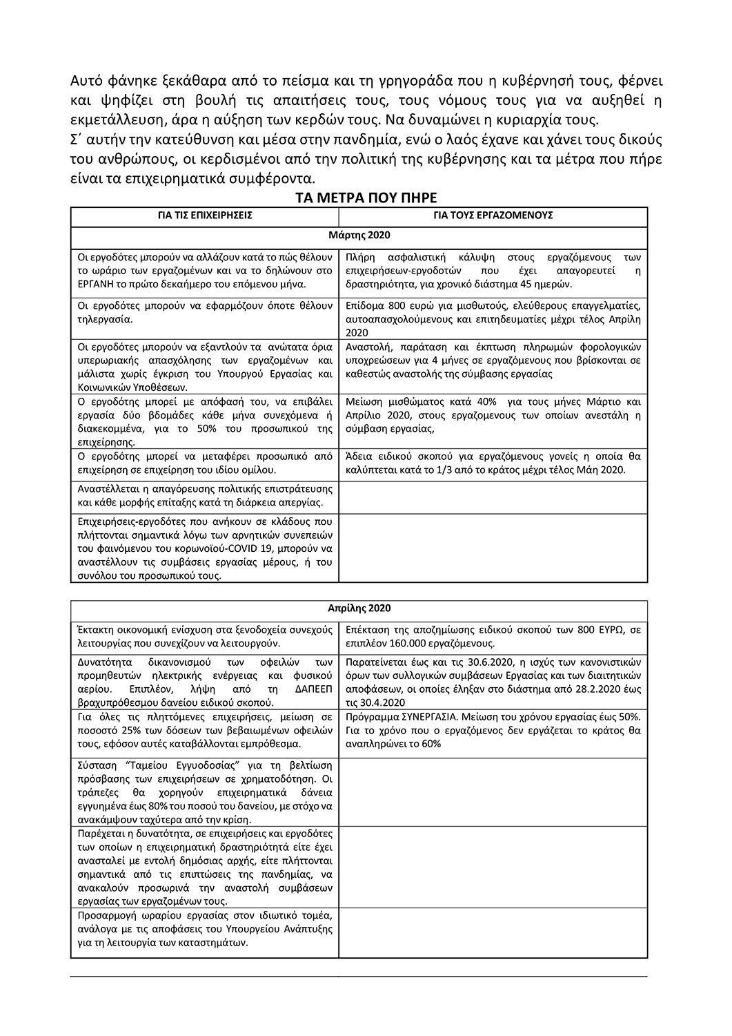 Ακόμη και τα μέτρα που πάρθηκαν για τη στήριξη των εργαζομένων, ήταν στην ουσία μέτρα που απάλλασσαν τη μεγαλοεργοδοσία από μισθούς και ασφαλιστικές εισφορές.