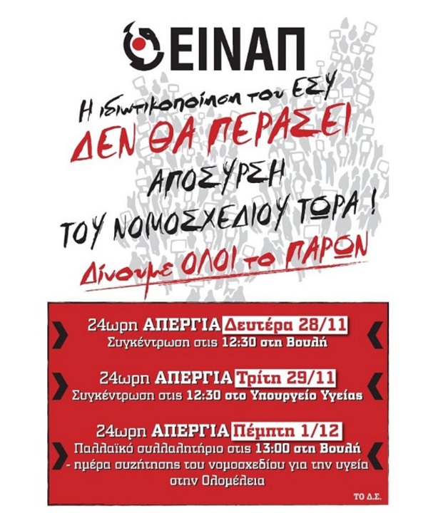 - Τρίτη 29/11: 24ωρη παναττική απεργία και συγκέντρωση στο Υπουργείο Υγείας.