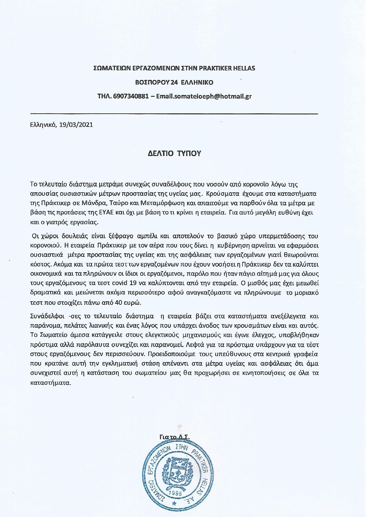 Οι χώροι δουλειάς είναι ξέφραγο αμπέλι και αποτελούν τον βασικό χώρο υπερμετάδοσης του κορονοϊού. Η εταιρεία Πράκτικερ με τον αέρα που της δίνει η κυβέρνηση αρνείται να εφαρμόσει ουσιαστικά μέτρα προστασίας της υγείας και της ασφάλειας των εργαζομένων γιατί θεωρούνται κόστος. Ακόμα και τα πρώτα τεστ των εργαζομένων που έχουν νοσήσει, η Πράκτικερ δεν τα καλύπτει οικονομικά και τα πληρώνουν οι ίδιοι οι εργαζόμενοι, παρόλο που ήταν πάγιο αίτημά μας για όλους τους εργαζόμενους τα τεστ covid 19 να καλύπτονται από την εταιρεία. Ο μισθός μας έχει μειωθεί δραματικά και μειώνεται ακόμα περισσότερο, αφού αναγκαζόμαστε να πληρώνουμε το μοριακό τεστ που στοιχίζει πάνω από 40 ευρώ.