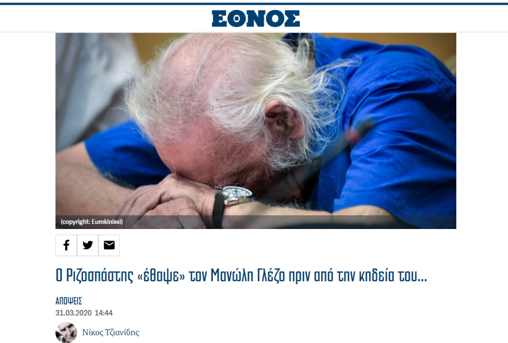 Αλλά το βραβείο χυδαιότητας κερδίζει με διαφορά ο αρθρογράφος του διαδικτυακού Έθνους Νίκος Τζιανίδης, που βάζει γκολ από τα αποδυτήρια, ήδη από τον τίτλο: ο Ριζοσπάστης έθαψε τον Γλέζο πριν από την κηδεία του