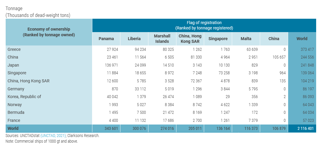 Σύμφωνα με στοιχεία της Infomaritime, που βασίζεται σε στοιχεία της UNCTAD, το 2021 στην Ελλάδα εγγράφονται 4705 πλοία με τη μέση μεταφορική ικανότητα του καθενός να αγγίζει τους 80 χιλιάδες τόνους (DWT). Το 2016, η ίδια πηγή αναφέρει 4131 πλοία με μέση μεταφορική ικανότητα μόλις 71 χιλιάδες τόνους.