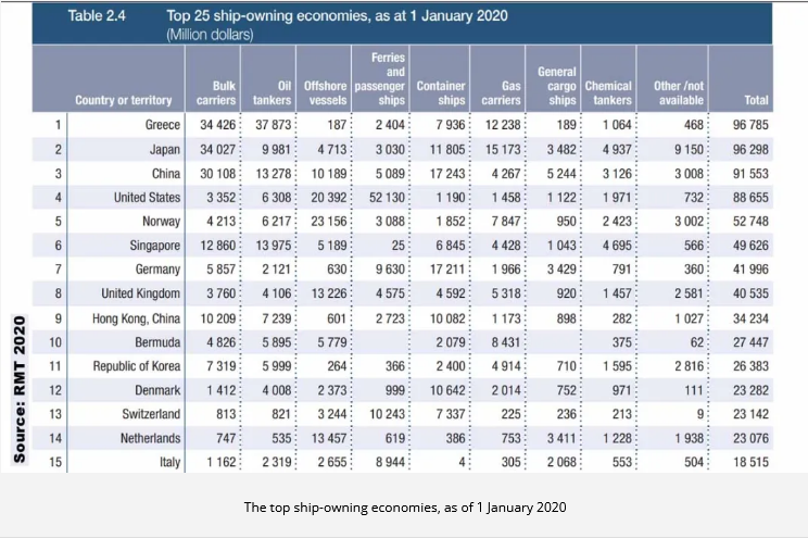 Μια άλλη προσέγγιση του ίδιου ζητήματος παρουσιάζεται στον επόμενο πίνακα. Εδώ φαίνεται η αξία των στόλων των 25 κορυφαίων ιδιοκτητριών οικονομιών, την 1η Ιανουαρίου 2020, ανά κατηγορία καραβιού. Σε αυτόν τον πίνακα, η Ελλάδα φιγουράρει πάλι πρώτη με στόλο αξίας σχεδόν 100 δις. Ολόκληρο το ΑΕΠ της “ιδιοκτήτριας” χώρας την ίδια χρονιά ήταν 165 δις…