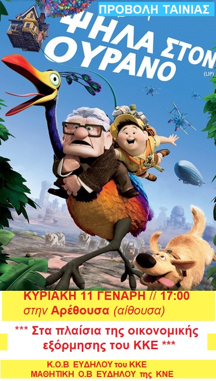 Υποδεχόμαστε την νέα χρονιά με την προβολή της παιδικής ταινίας “Ψηλά στον ουρανό“, στα πλαίσια της οικονομικής ενίσχυσης του ΚΚΕ και της ΚΝΕ, την Κυριακή 11 Γενάρη στην Αρέθουσα