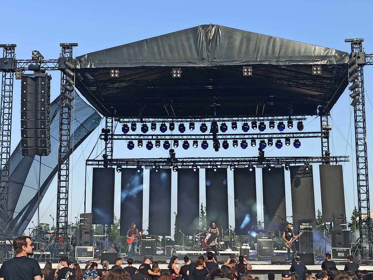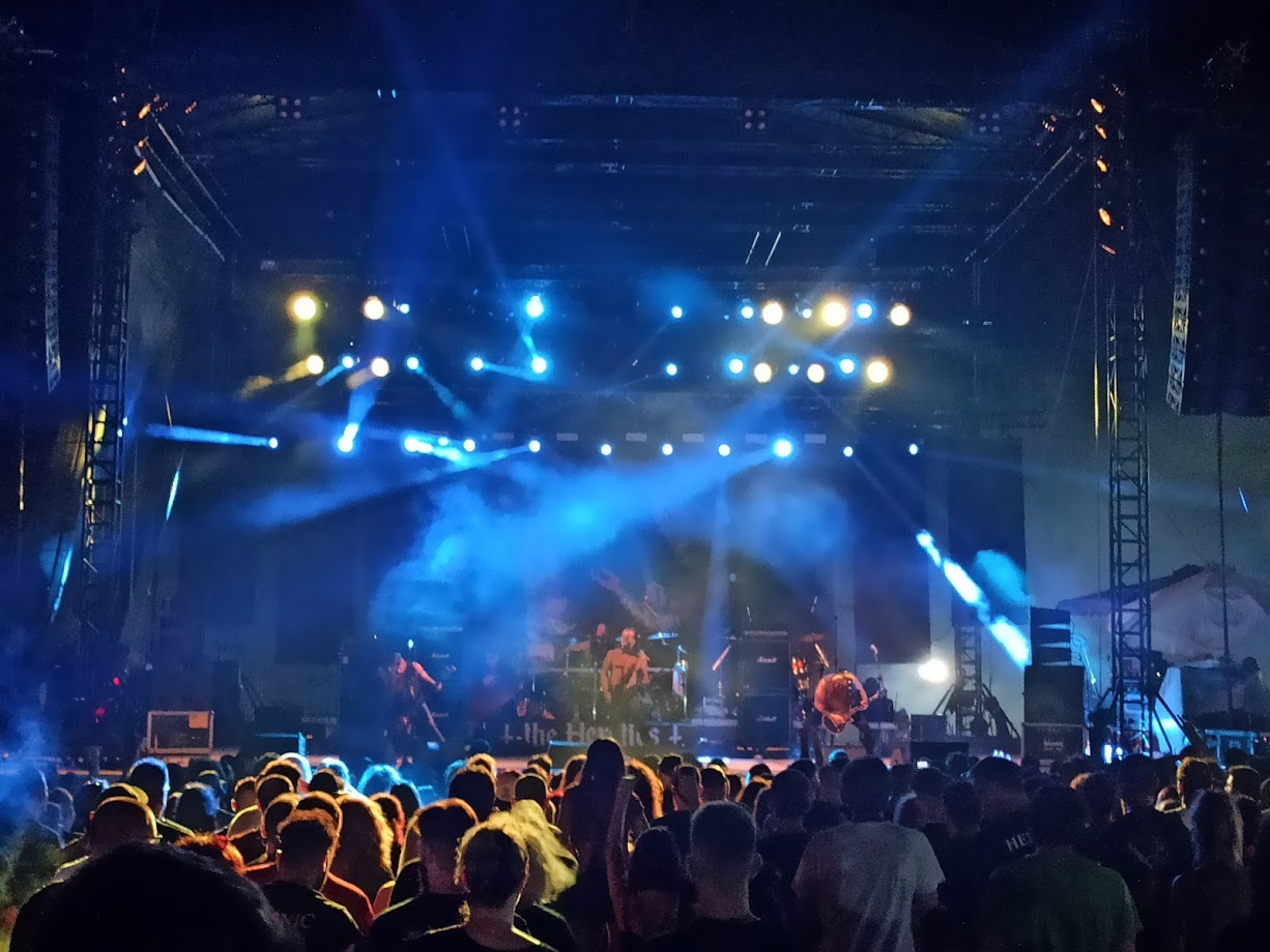 Η πρώτη εντύπωση του χώρου ήταν αποκαρδιωτική. Ένα καθαρισμένο χωράφι με μία μέτρια σκηνή και κιόσκια για μπύρες. Δεν αφήσαμε όμως την πρώτη εντύπωση να μας πάρει από τα μούτρα. Μπήκαμε από τους πρώτους στην ουρά, φορέσαμε τις μάσκες μας, τηρήσαμε τις αποστάσεις. Βρήκαμε το πανηγυροτράπεζο μας και αράξαμε. Εν μέσω πανδημίας δεν καταλαβαίνω τις διαδικτυακές γκρίνιες για τις πλαστικές καρέκλες και τις αποστάσεις και δηλώσεις τύπου “του headbanger ο τράχηλος ζυγό δεν υπομένει”.